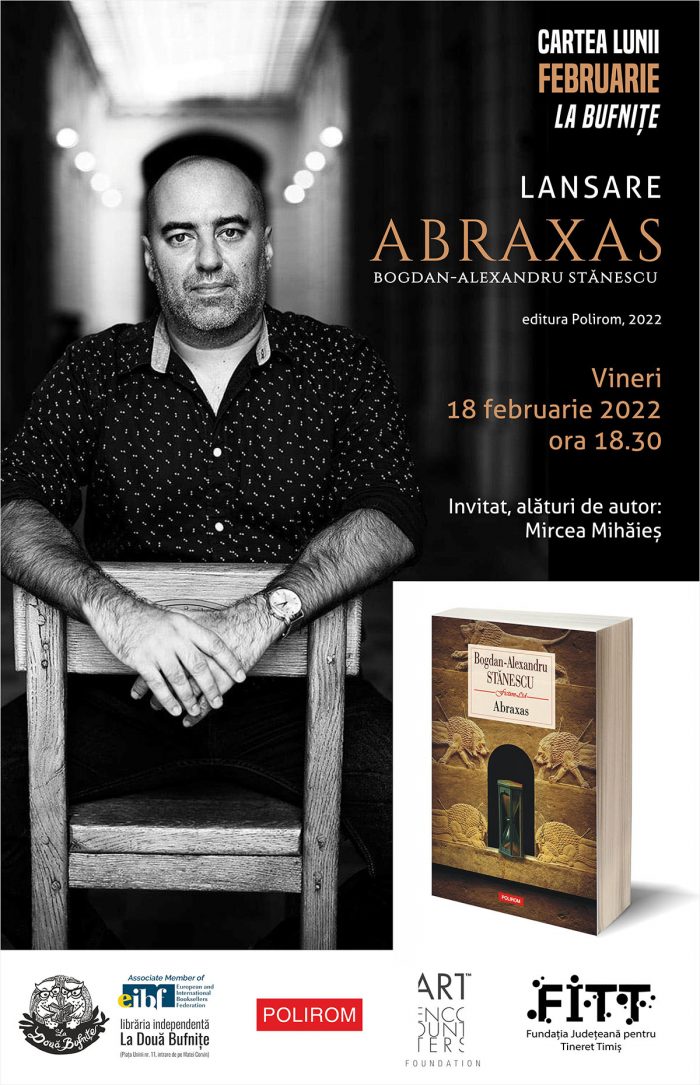 Vineri, 18 februarie 2022, de la ora 18.30, cititorii sunt așteptați la librăria independentă La Două Bufnițe (Piața Unirii nr. 11, intrare de pe Matei Corvin), la lansarea romanului Abraxas, de Bogdan-Alexandru Stănescu, apărut recent la editura Polirom. Invitat, alături de autor, este scriitorul și criticul literar Mircea Mihăieș. Lansarea romanului va fi urmată de o sesiune de autografe.