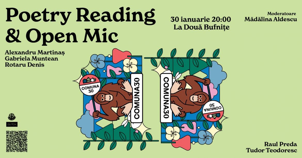 Comuna 30 celebrează 2 ani de existență în lumea literară, iar cu această ocazie, pe 30 ianuarie, ora 20:00, organizăm un Poetry & Jam Session care va culmina cu un Open Mic afterparty. Evenimentul va avea loc la librăria „La Două Bufnițe”, unde de altfel cenaclul și-a început activitatea.