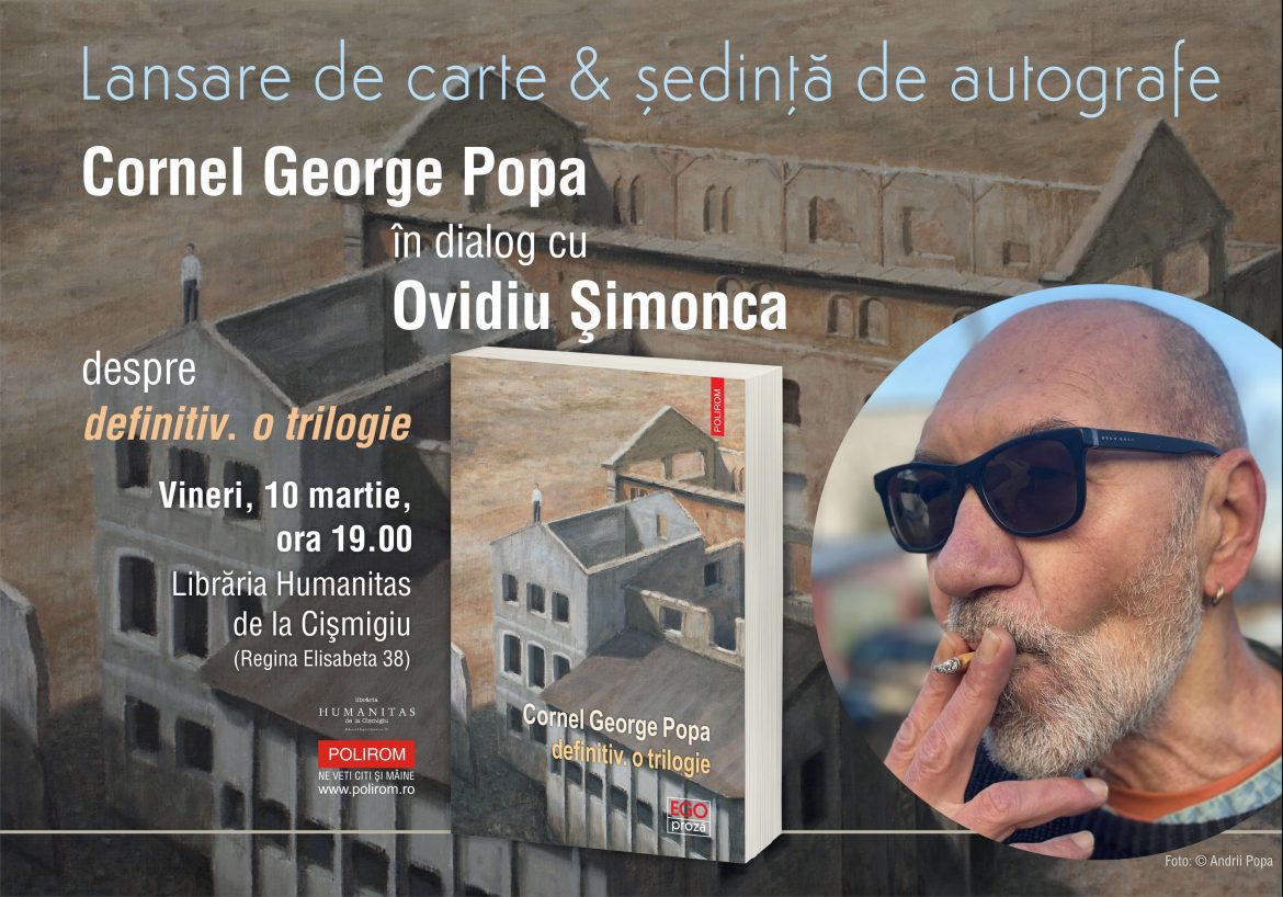 Vineri, 10 martie, ora 19.00, la Librăria Humanitas de la Cișmigiu (Regina Elisabeta 38), Cornel George Popa va intra în dialog cu Ovidiu Șimonca, pornind de la volumul definitiv. o trilogie de Cornel George Popa, publicat de curând în colecția Ego. Proză a editurii Polirom.