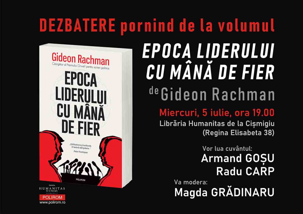 Miercuri, 5 iulie, ora 19.00, la Librăria Humanitas de la Cișmigiu (Regina Elisabeta 38, București), va avea loc o dezbatere pornind de la volumul Epoca liderului cu mână de fier, de Gideon Rachman, publicat de curând la Editura Polirom, traducere din limba engleză de Dan Bălănescu.