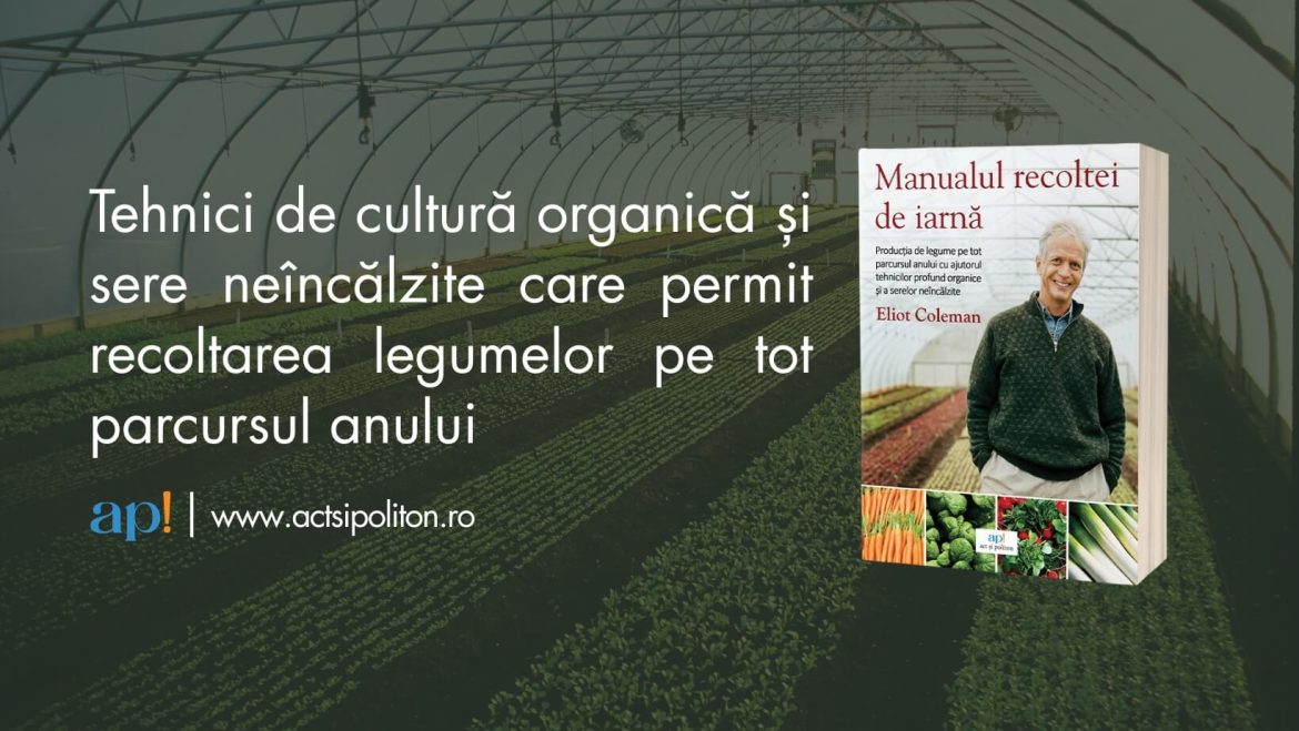 Apărută în urmă cu 17 ani, Manualul recoltei de iarnă, de Eliot Coleman, este considerată în continuare o carte de căpătâi atât pentru agricultorii experimentați, cât și pentru cei care își doresc să aibă parte de hrană sănătoasă pe tot parcursul anului, inclusiv în anotimpul geros. Pentru unii oameni, grădinăritul este doar o sursă de relaxare, pentru alții o modalitate de a se întreține, pentru toți, însă, legumele din grădinile proprii sunt o sursă de hrană sănătoasă. Volumul de față vine cu o perspectivă mai puțin vehiculată până acum, și anume: iarna nu trebuie să fie un obstacol în agricultură, ci poate fi momentul prielnic pentru a cultiva altfel de verdețuri, acelea cărora nu le displace frigul, ba dimpotrivă, le priește.
