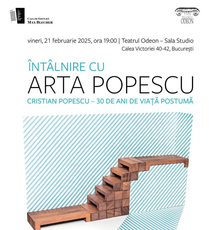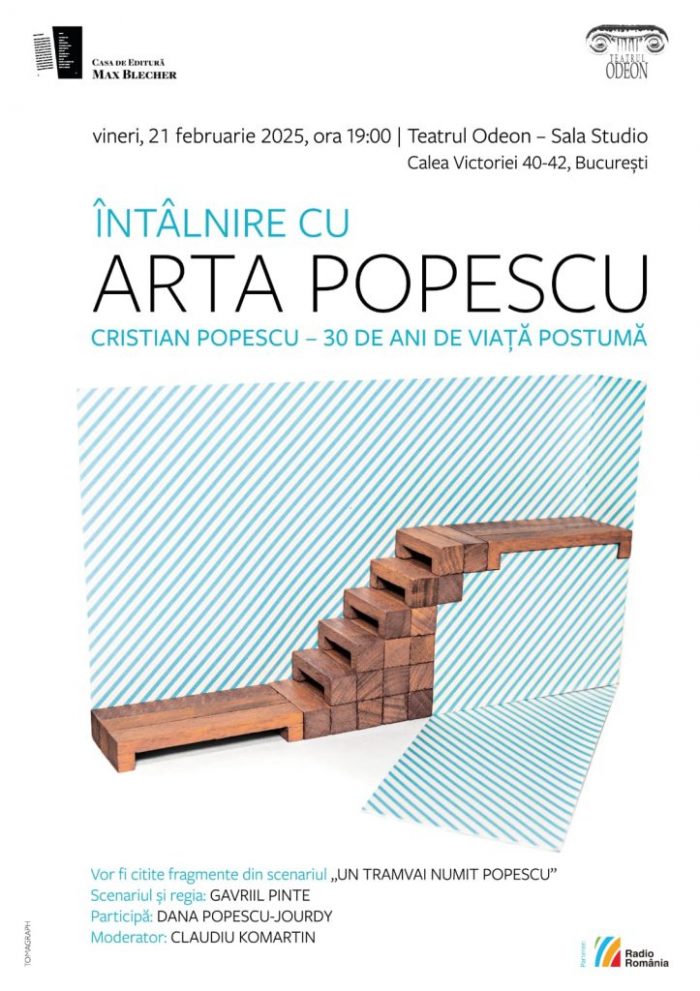 Vineri, 21 februarie, ora 19.00, vă invităm în Sala Studio, la o Întâlnire cu ARTA POPESCU. Cristian Popescu – 30 de ani de viață postumă, omagiu adus poetului Cristian Popescu (1959 – 1995), unul dintre cei mai originali poeți ai generației ‘90.