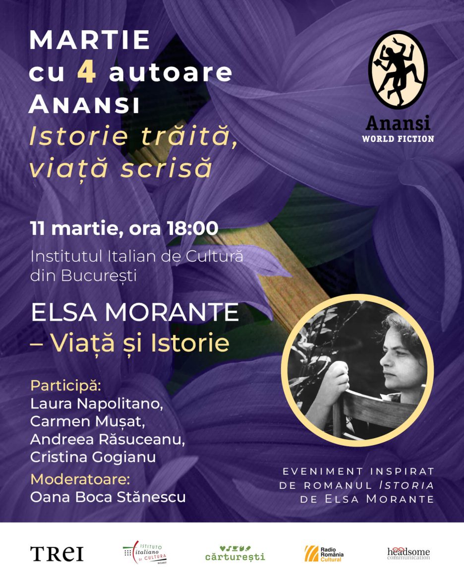 Editura Trei, prin imprintul Anansi. World Fiction, și Institutul Italian de Cultură din București îi invită pe iubitorii de literatură din capitală miercuri, 11 martie, începând cu ora 18:00, la cel de-al doilea eveniment din seria „Istorie trăită, viață scrisă”, dedicată literaturii uneia dintre cele mai puternice voci ale secolului XX: Elsa Morante. Întâlnirea va avea loc la sediul Institutului Italian de Cultură din București (Aleea Alexandru nr. 41), iar în centrul discuției se va afla romanul Istoria (La Storia), considerat capodopera îndrăgitei scriitoare italiene.