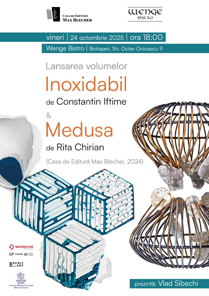Casa de Editură Max Blecher, în parteneriat cu Memorialul Ipotești – Centrul Național de Studii „Mihai Eminescu”, vă invită vineri, 24 octombrie 2025, de la ora 18:00, în Wenge Bistro (Botoșani, str. Octav Onicescu nr. 9), la lansarea volumelor „Inoxidabil”, de Constantin Iftime, și „Medusa”, de Rita Chirian. Evenimentul va fi moderat de Vlad Sibechi.