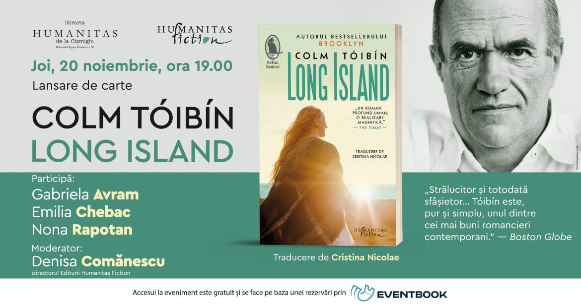 Joi, 20 noiembrie, de la ora 19.00, Editura Humanitas Fiction vă așteaptă la Librăria Humanitas de la Cișmigiu (Bulevardul Regina Elisabeta 38), la lansarea romanului Long Island, de Colm Tóibín, apărut în colecția Raftul Denisei, în traducerea Cristinei Nicolae.