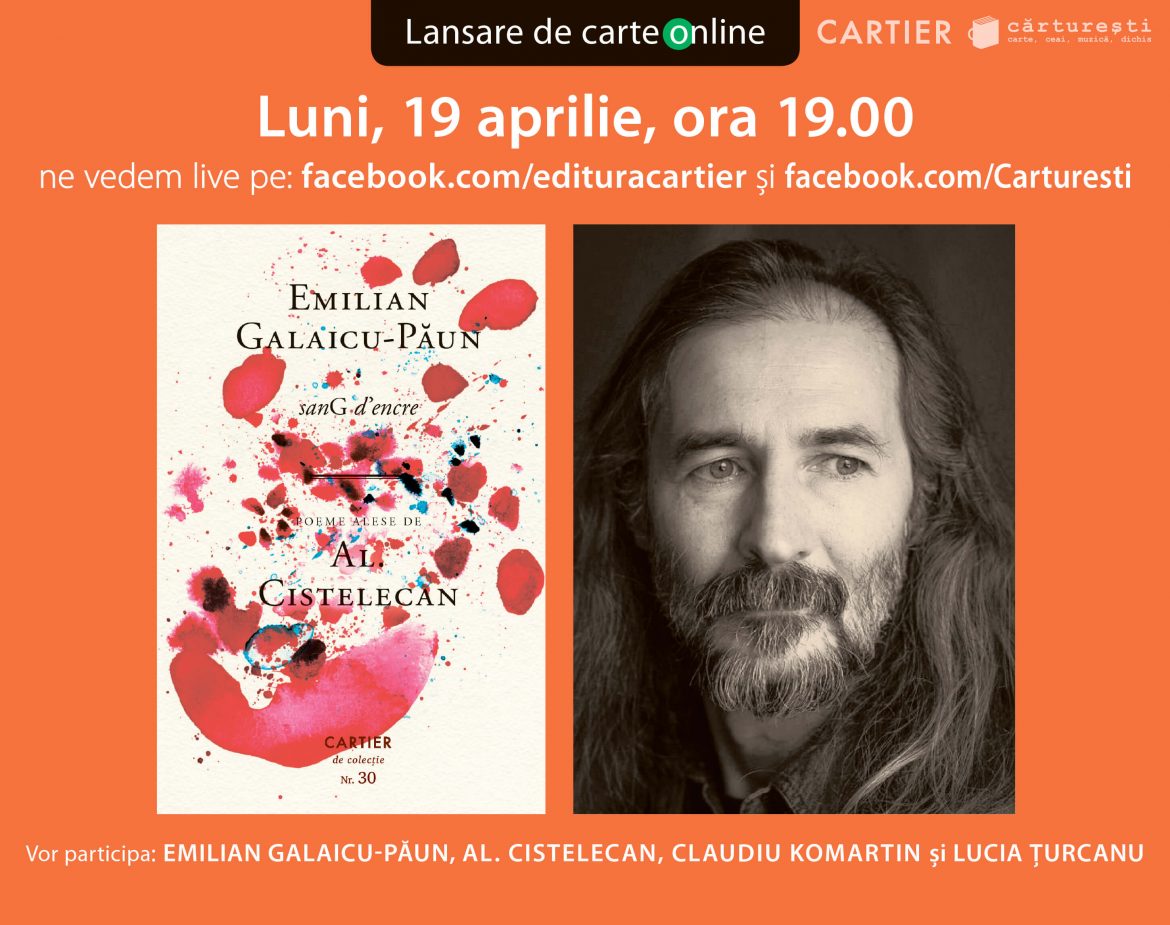 Luni, 19 aprilie, ora 19.00, vă invităm la lansarea online a volumului Emilian Galaicu-Păun. sanG d”encre. Poeme alese de Al.Cistelecan, fotografii de Roman Rybaleov, apărut în Cartier de colecție nr. 30, la Editura Cartier.