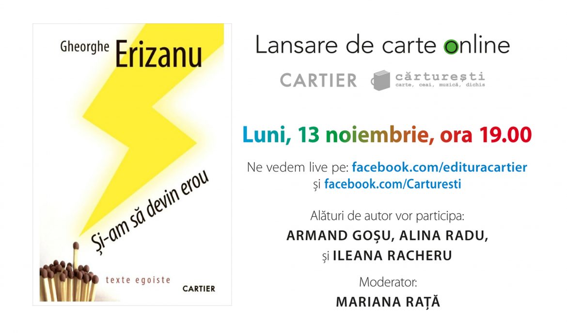 Luni, 13 noiembrie, ora 19.00, vă invităm la lansarea online a volumului Și-am să devin erou, deGheorghe Erizanu, apărut la Editura Cartier, colecția Rotonda. Alături de autor vor participa : Armand Goșu, Alina Radu și Ileana Rachieru. Moderatoare: Mariana Rață.