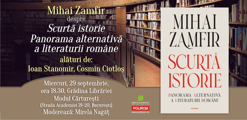 Miercuri, 29 septembrie, ora 18.30, în Grădina Librăriei Modul Cărturești (Strada Academiei 18-20, București), Mihai Zamfir va vorbi despre volumul „Scurtă istorie. Panorama alternativă a literaturii române” (ediţia a II‑a revăzută şi adăugită, Editura Polirom, 2021), alături de Ioan Stanomir și Cosmin Ciotloș. Moderează: Mirela Nagâț. La finalul evenimentului va avea loc o ședință de autografe.