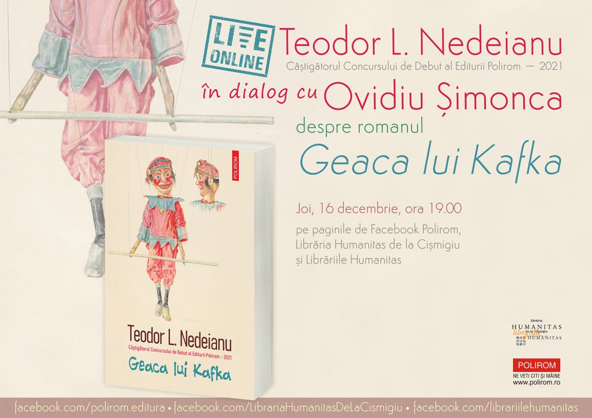 Joi, 16 decembrie, la ora 19.00, Editura Polirom lansează online & live, pe paginile de Facebook Polirom, Librăria Humanitas de la Cișmigiu și Librăriile Humanitas, romanul „Geaca lui Kafka”, de Teodor L. Nedeianu, câştigătorul Concursului de Debut al Editurii Polirom – 2021. Lansarea va prilejui un dialog al autorului cu Ovidiu Șimonca.