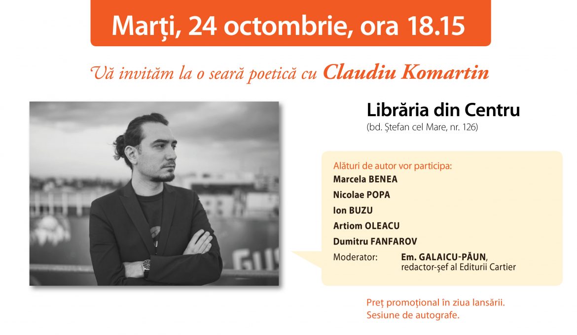 Marți, 24 octombrie crt., la ora 18.15, va avea loc Seara poetică de la Librăria din Centru cu participarea lui Claudiu Komartin și a invitaților săi: Marcela Benea, Nicolae Popa, Ion Buzu, Artiom Oleacu și Dumitru Fanfarov. Moderator: Em.Galaicu-Păun. Sesiune de autografe.