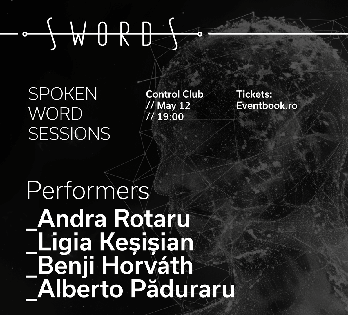 SWORDS – Spoken Word Sessions își propune să aducă laolaltă poeți, actori, autori și performeri, în spectacole spoken word, completate de muzică și proiecții multimedia. Curatori: Cosmin Perța și Iulian Morar.
