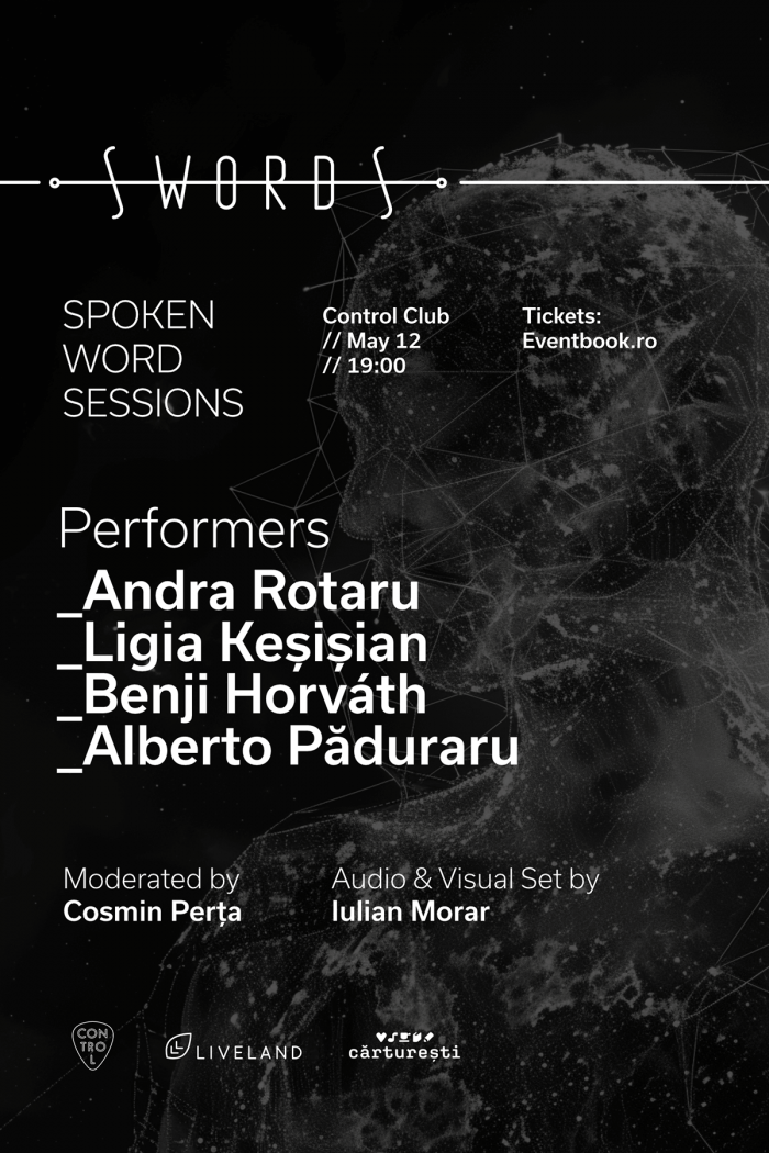 Un nou episod din seria SWORDS – Spoken Word Sessions îi aduce pe scenă pe autorii Andra Rotaru, Ligia Keșișian, Benji Horváth și Alberto Păduraru, într-un eveniment moderat de Cosmin Perța – duminică, 12 mai, de la ora 19, la Control Club. Performance-urile vor fi completate de un set audio-vizual de Iulian Morar. Biletele, în număr limitat, sunt disponibile în rețeaua Eventbook.