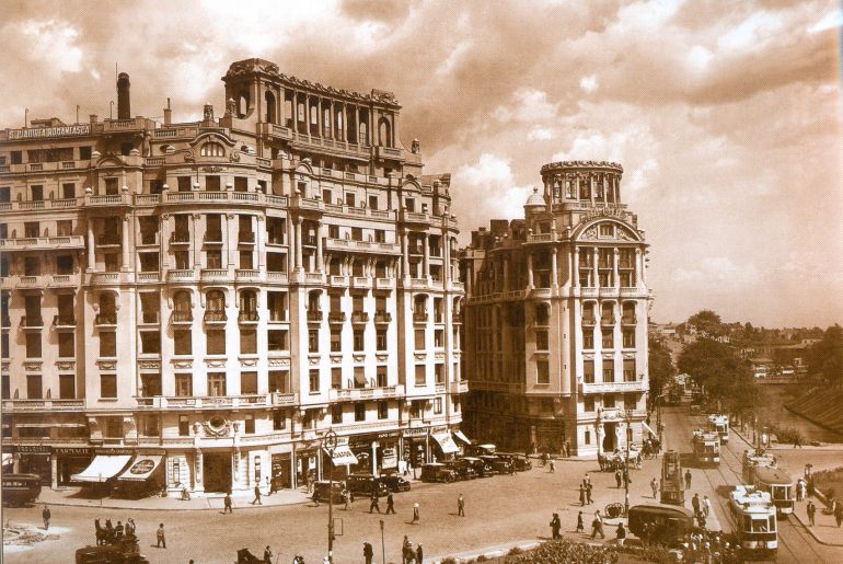 Intersecția bulevardul Elisabeta cu Calea Victoriei, în octombrie 1989. În dreapta se vede colțul Hotelului Bulevard, iar pe fundal blocul Delta Dunării, construit după cutremurul din 1977. (foto de aici: https://www.anp-archief.nl) Vă spuneam, într-un material anterior, că voi reveni cu istoria casei Grecianu, care se afla pe locul unde acum este blocul Delta Dunării (la