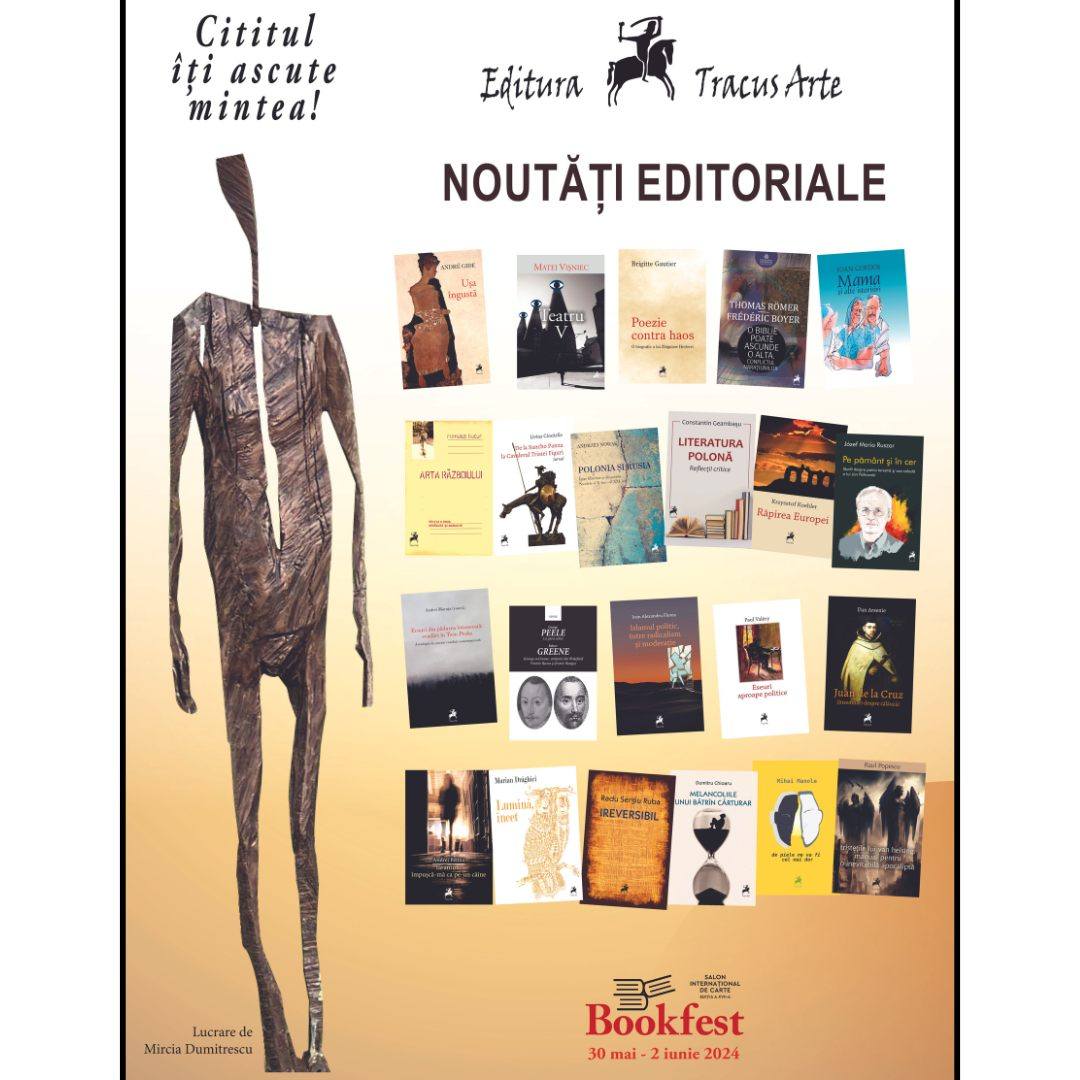 În perioada 29 mai-2 iunie, cu peste 800 de titluri semnate de autori români și străini: poezie, jurnale, memorii, eseu, critică și teorie literară, roman, studii, filozofie, toate cu prețuri reduse și cu mai mult de 50%, editura Tracus Arte vă invită la Romexpo, pavilionul B2, Stand G 03, să participați la lansări, lectură publică și întâlniri cu autorii.