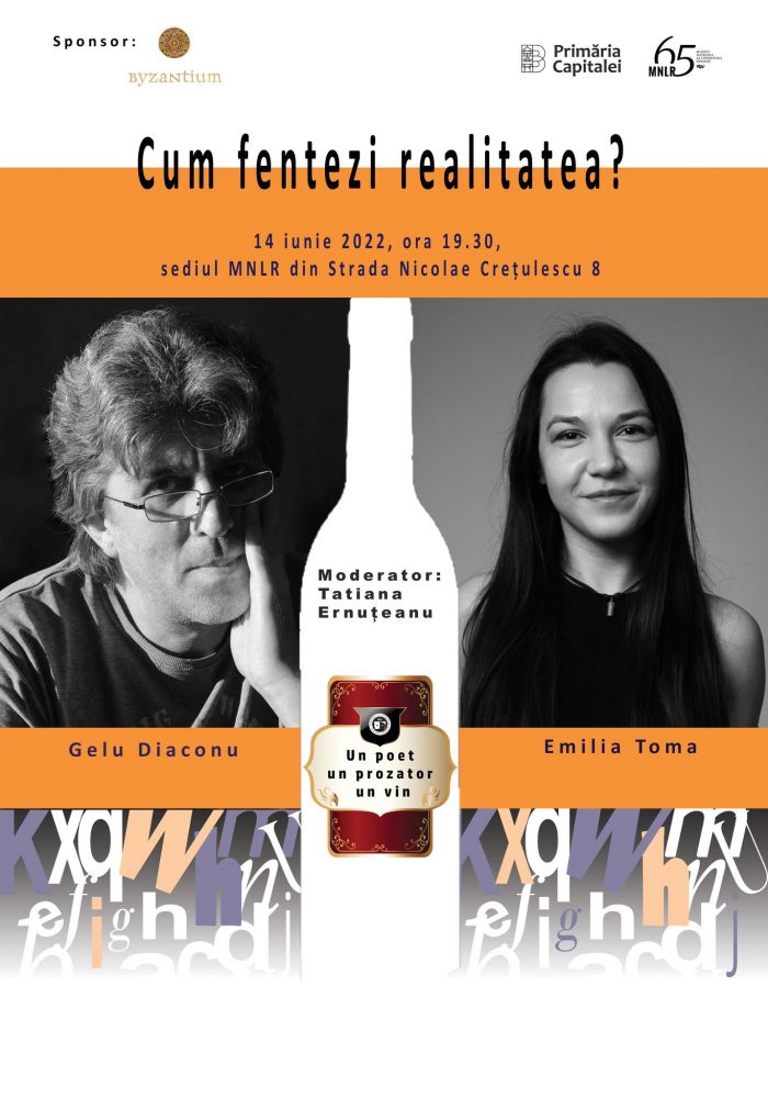 Muzeul Național al Literaturii Române vă invită marți, 14 iunie 2022, de la ora 19.30, în Grădina din Str. Nicolae Crețulescu 8, la evenimentul „Un poet, un prozator, un vin” #5. Tema: Cum fentezi realitatea? Invitați: Gelu Diaconu și Emilia Toma. Moderator: Tatiana Ernuțeanu.