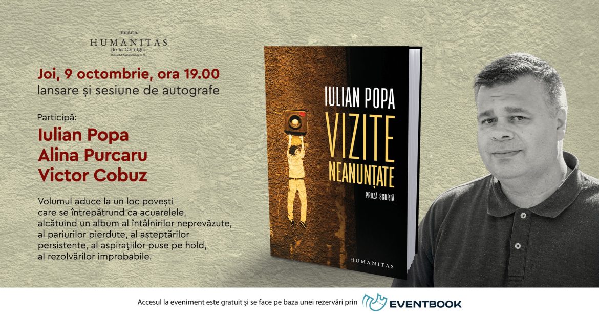 Editura Humanitas vă invită joi, 9 octombrie, ora 19.00, la Librăria Humanitas de la Cișmigiu la o întâlnire cu scriitorul Iulian Popa, scriitoarea Alina Purcaru și criticul literar Victor Cobuz, prilejuită de lansarea volumului de proze scurte „Vizite neanunțate”, de Iulian Popa, o serie de povestiri care alcătuiesc „un album al întâlnirilor neprevăzute, al pariurilor pierdute, al așteptărilor persistente, al aspiraţiilor puse pe hold, al rezolvărilor improbabile”.