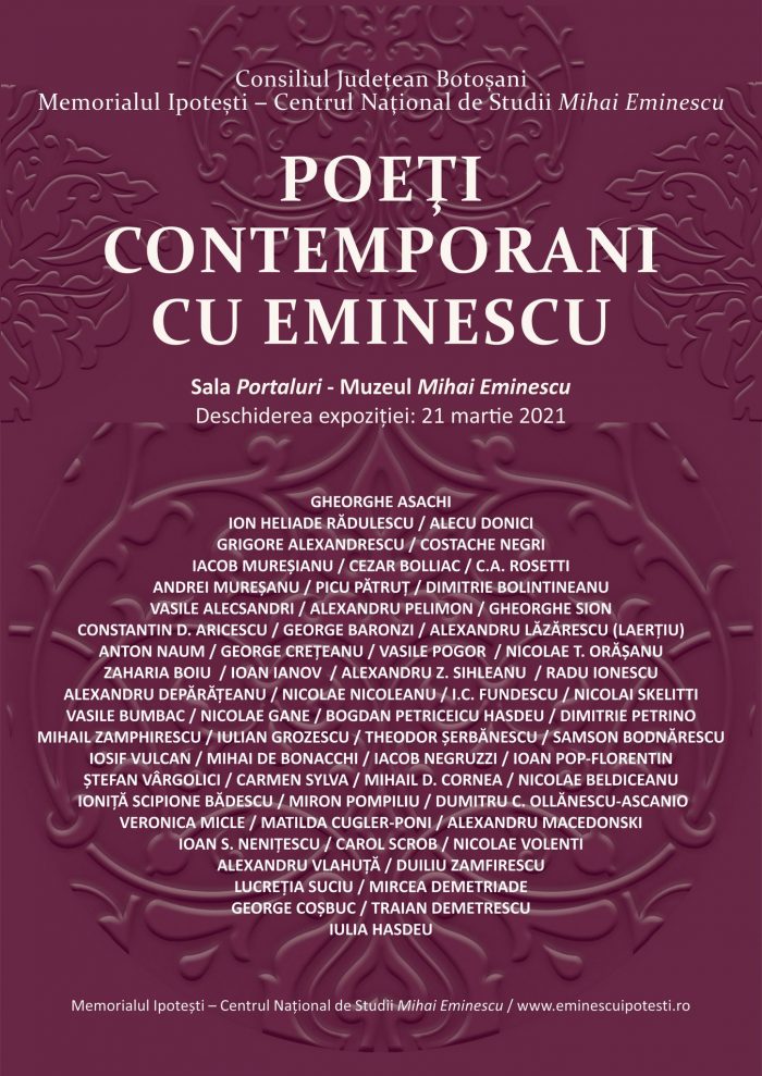 O altă expoziție, intitulată Poeți contemporani cu Eminescu, va fi vernisată, la ora 11.00, în Sala Portaluri a Memorialul Ipotești. În expoziție sunt prezentați 62 de poeți – de la Gheorghe Asachi (1788-1869) la Iulia Hasdeu (1869-1888) – din Moldova, Muntenia și Transilvania, care făceau parte, în anii ′60-′80 ai secolului al XIX-lea, din ceea ce am putea numi procesul poetic românesc: „bătrânii” care mai erau în viață atunci când Eminescu debuta, colegi de la Junimea sau congeneri din alte spații, pe care poetul poate că nu i-a cunoscut, dar fără de care panorama poeziei românești din acea perioadă nu ar fi completă, „tineri” care au debutat până în 1889.