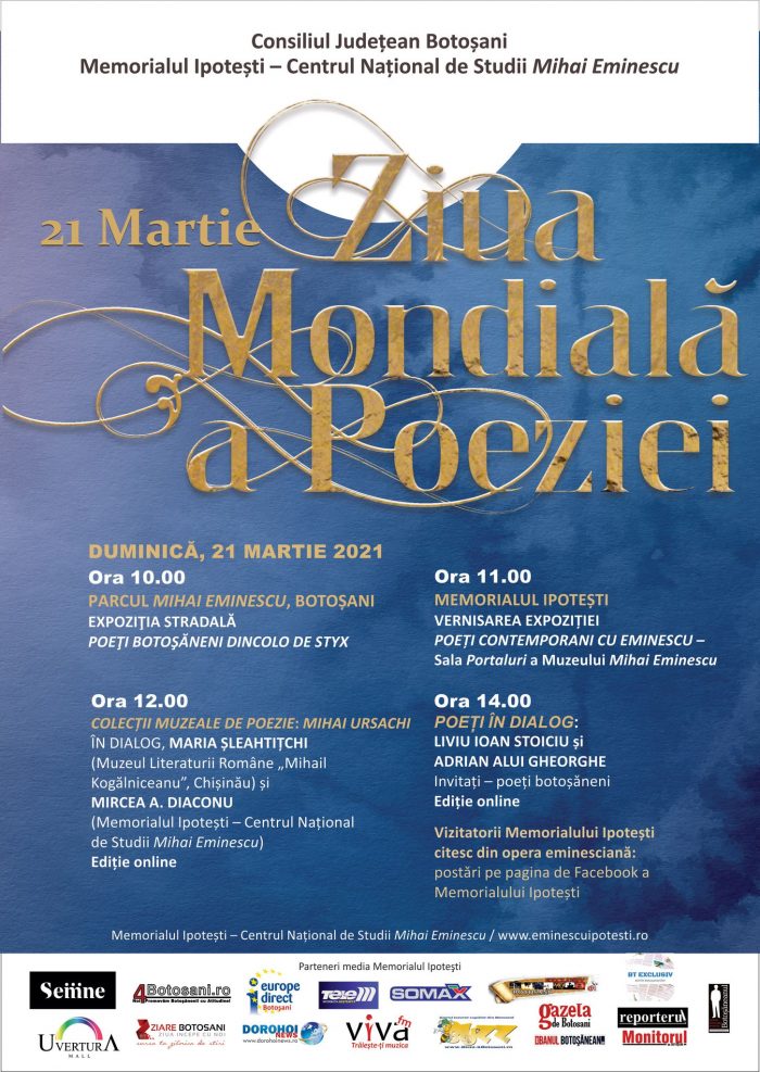 Cu prilejul Zilei Mondiale a Poeziei, Memorialul Ipotești – Centrul National de Studii „Mihai Eminescu” organizează, pe 21 martie, mai multe activități.